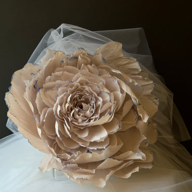 Questa elegantissima peonia è realizzata in carta crespa leggera grigio perla chiaro con petali screziati da lievi tocchi di azzurro polvere che richiamano i cieli più puri.