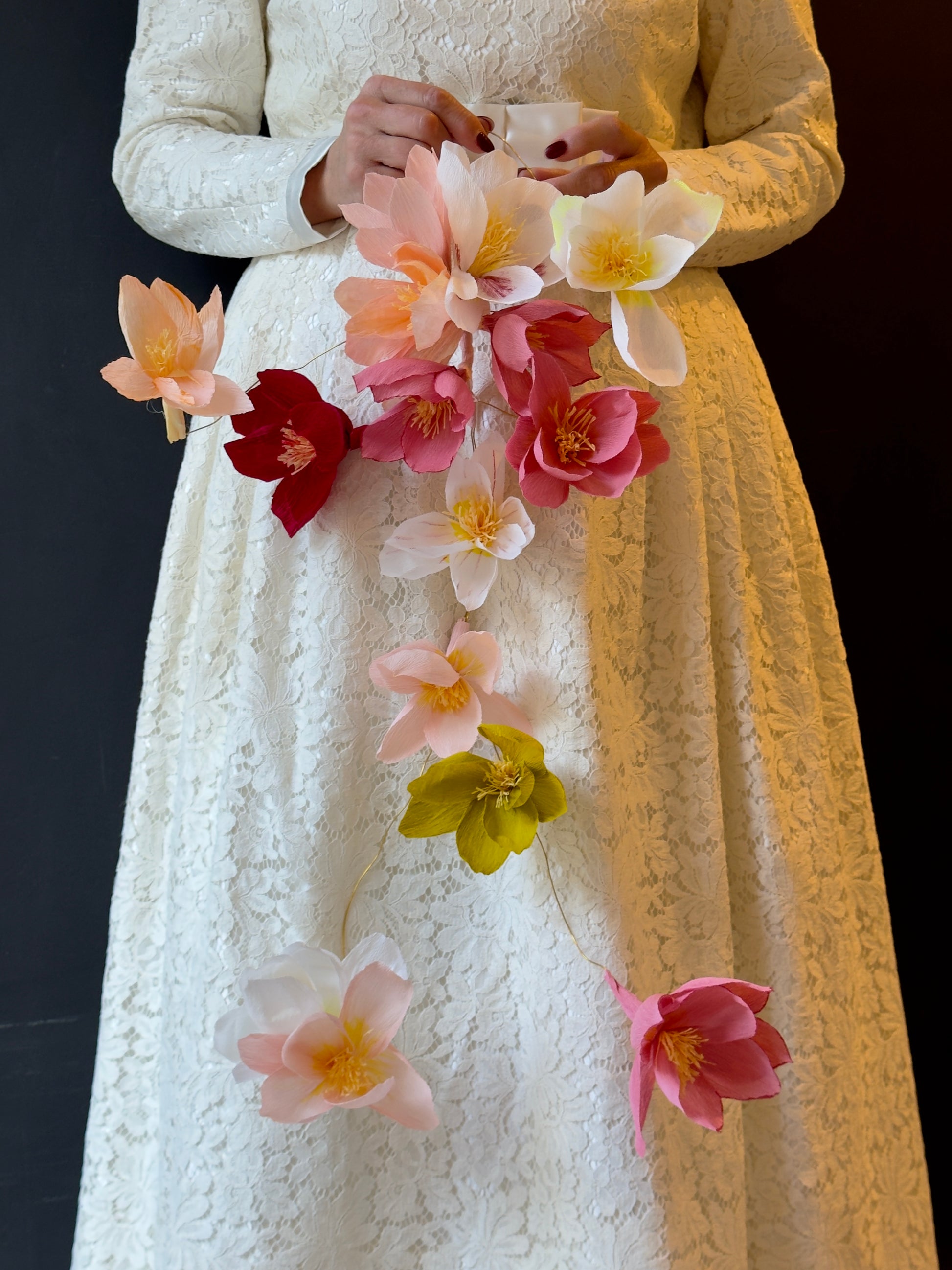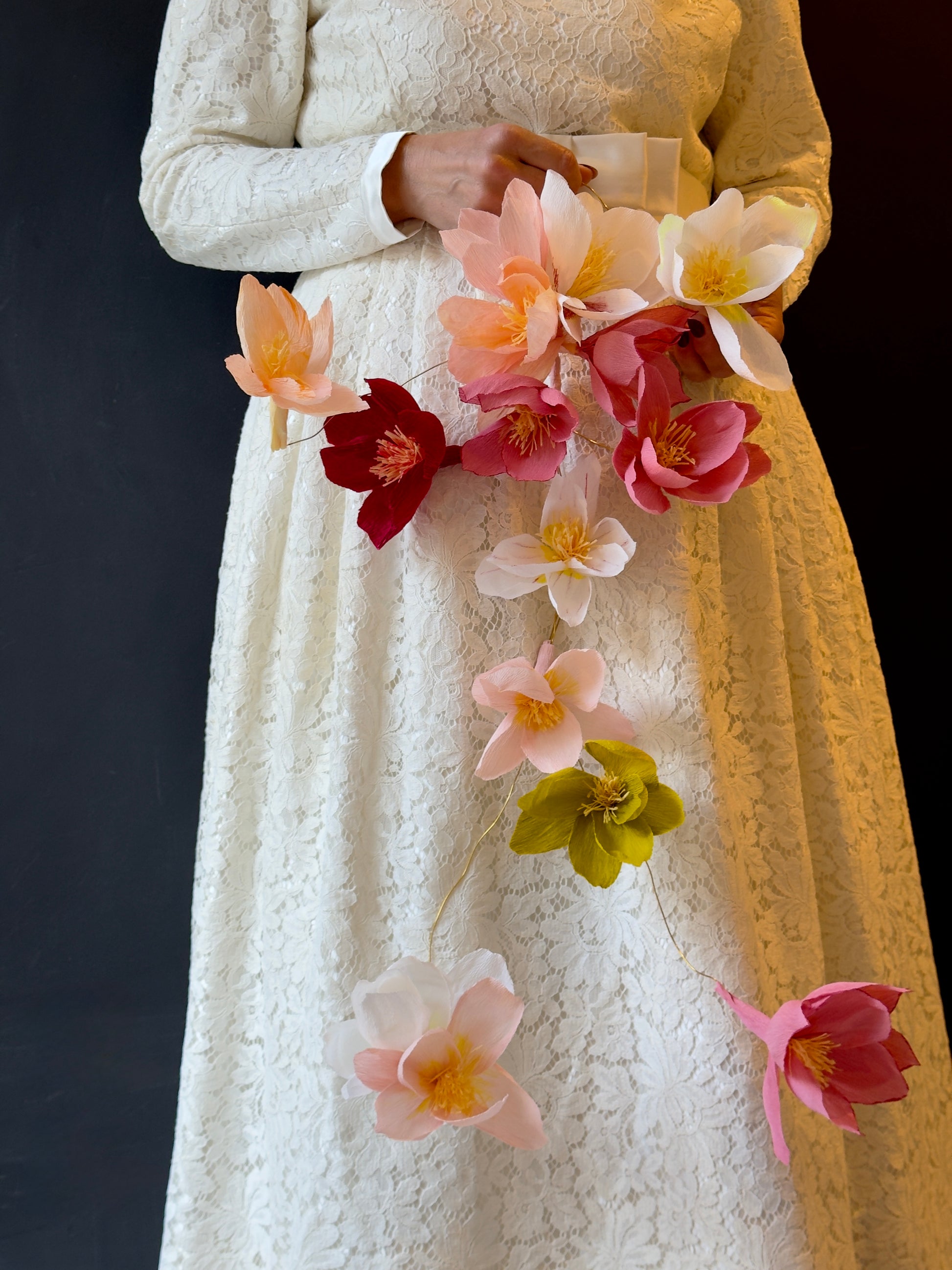 Cascata floreale in carta crespa dalle delicate tonalità pastello, rosa, pesca avorio con rami flessuosi e ondeggianti che creano movimento.