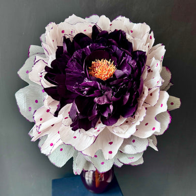 Fiore in carta crespa grigia chiara e bianca, decorato a mano con pois color ciliegia.