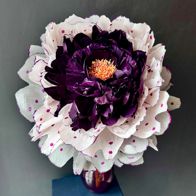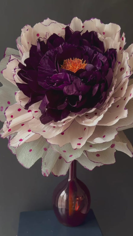 I petali interni sono in carta color prugna e stami gialli screziati in scuro.