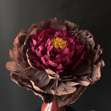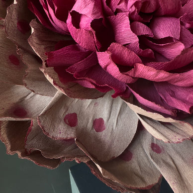 Fiore in carta crespa color fango decorata con pois bordeaux, interno di stami gialli e petali bordeaux.
