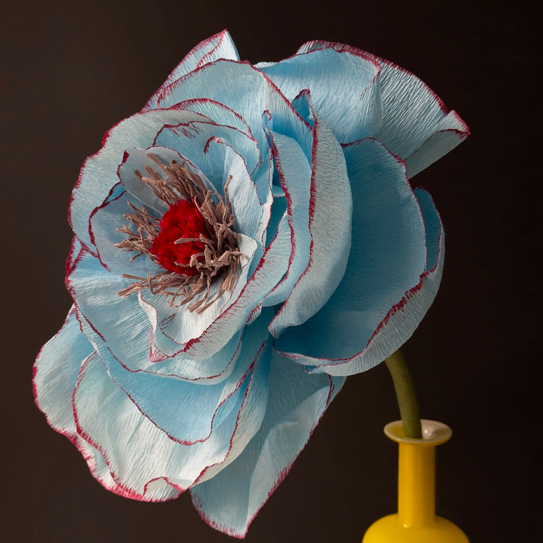 Fiore in carta crespa celeste con stami rossi e grigi e screziature rosse.
