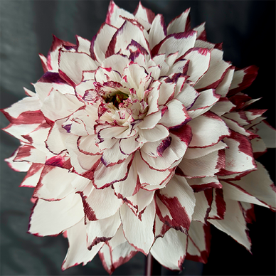Fiore in carta crespa color panna con una corolla molto ricca e con pennellate bordeaux sui petali.