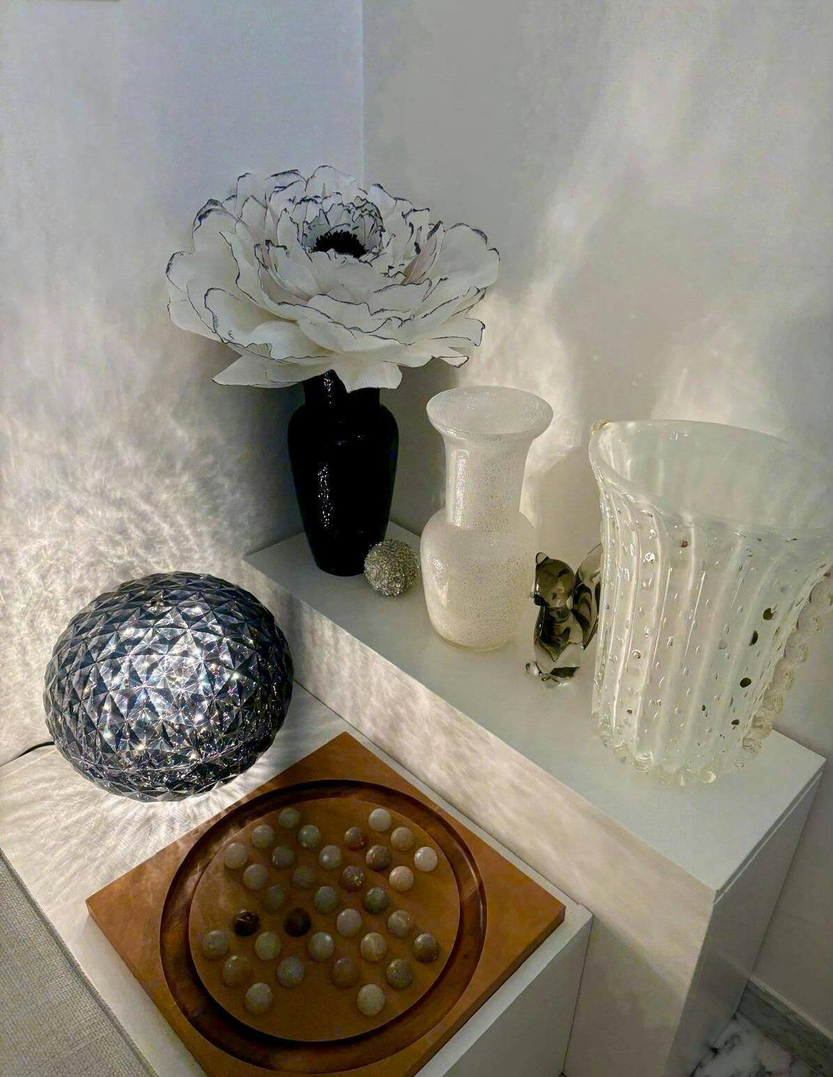 Fiore in carta crespa bianca con striature grigie. Stami neri e grigi.