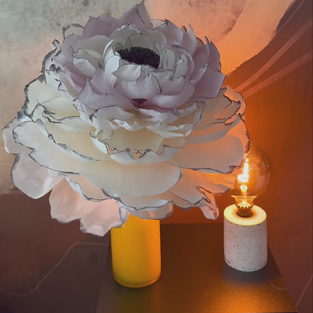 Fiore in carta crespa bianca con striature grigie. Stami neri e grigi.