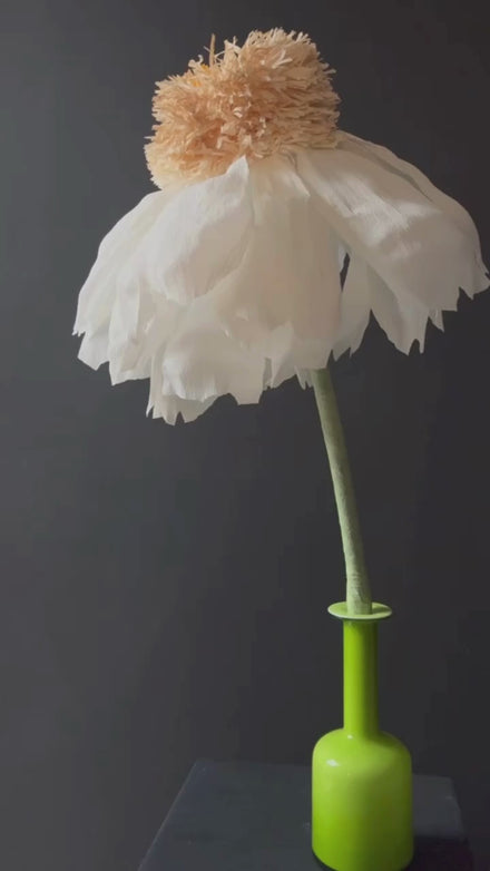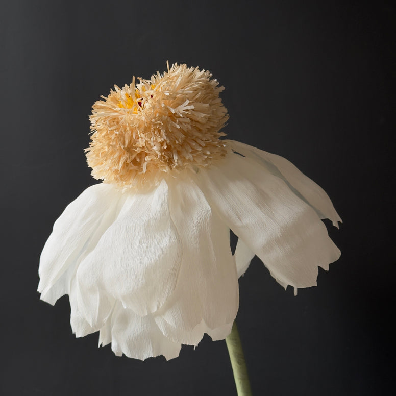 Echinacea suprema in carta crespa color panna, con stami a pom pom rossi verdi e gialli.