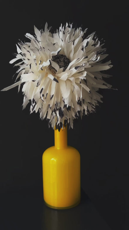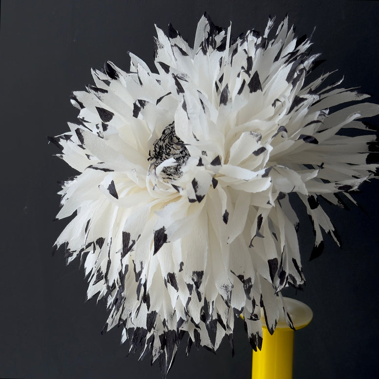 Fiore in carta crespa leggera bianca con pennellate sui bordi dei petali in nero. Stami centrali bianchi con screziature nere.