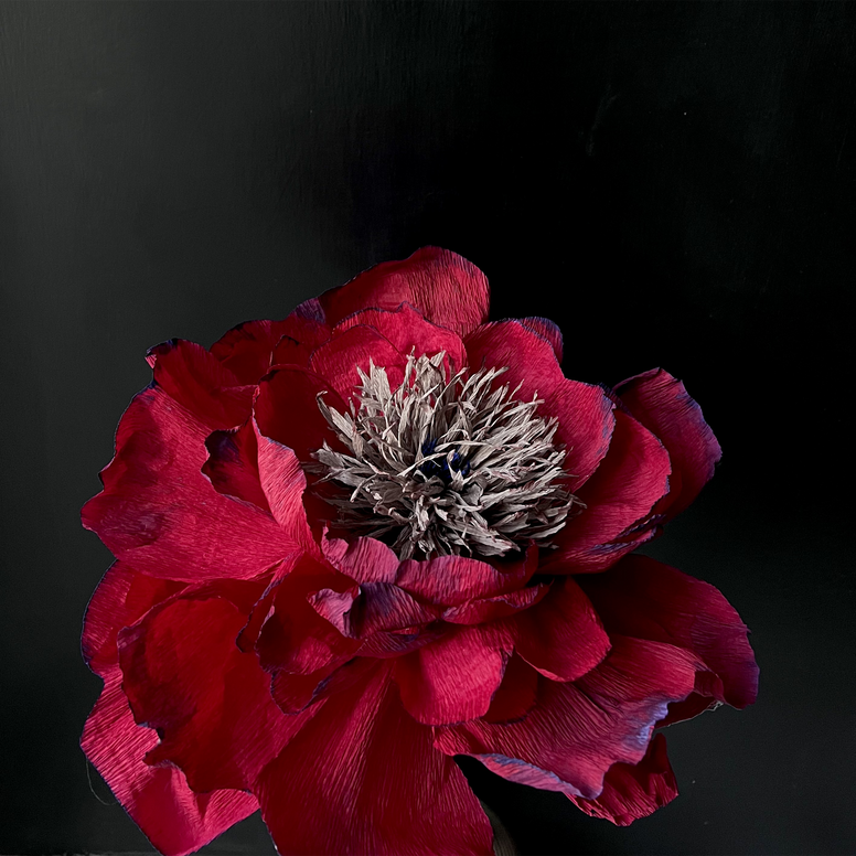 Peonia giapponese in carta crespa bordeaux, con screziature dipinte in blu elettrico e stami grigi screziati di rosso scuro.