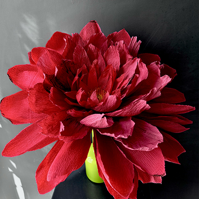 Dalia extra large in carta crespa rossa ciliegia con striature più scure e stami gialli.