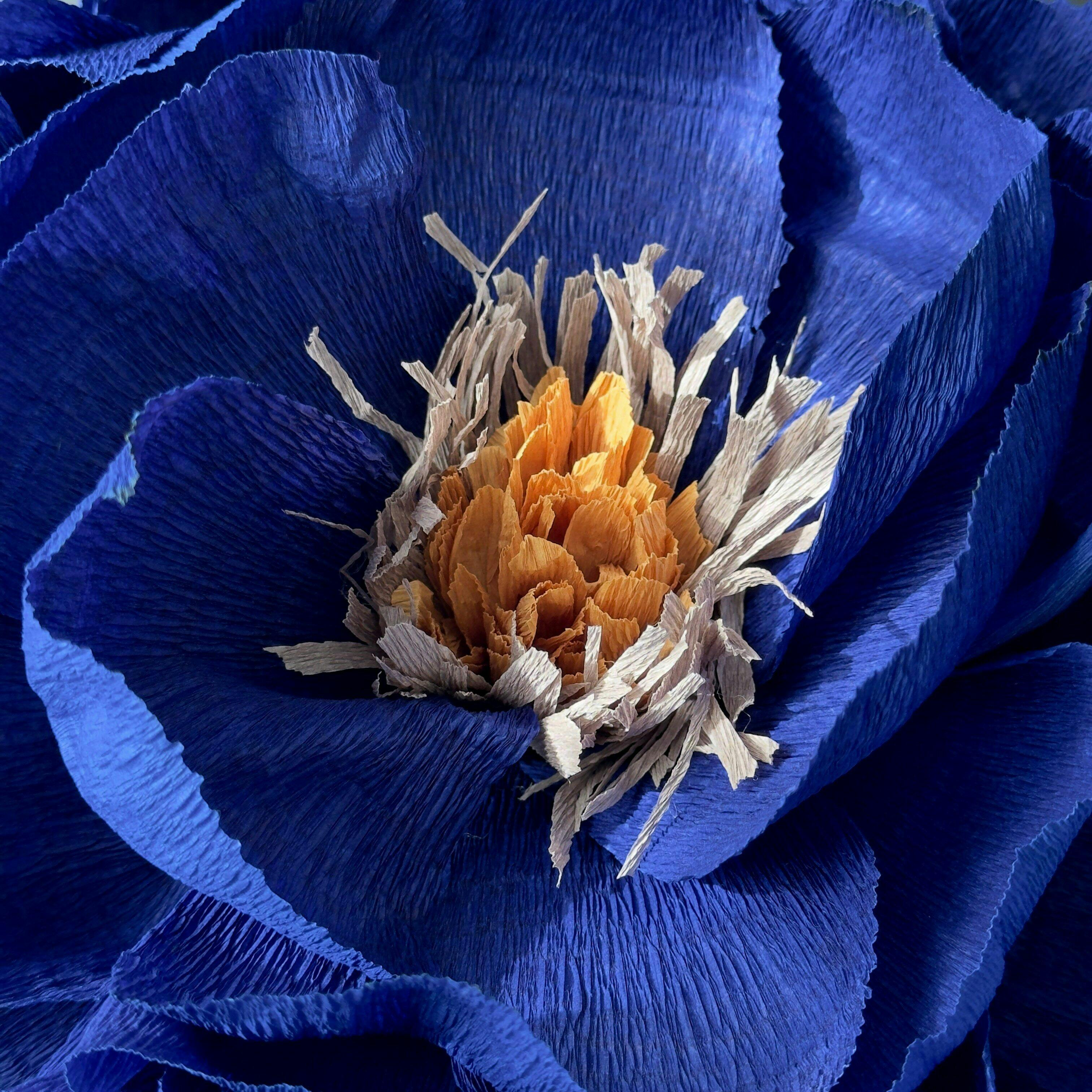 Fiore in carta crespa blu scuro con stami beige e grigi.