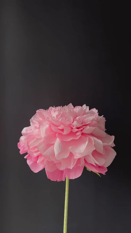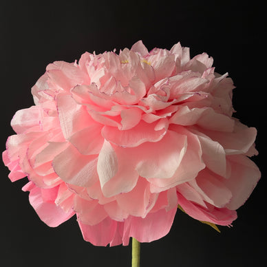Peonia in carta crespa rosa, con stami gialli e leggere screziature sui bordi.